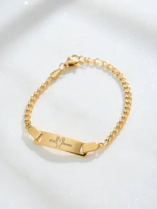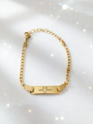 Preciosa pulsera con un grabado especial del Real Madrid. - Diseño de eslabones. - Placa central con el escudo y nombre del equipo. - Cierre de mosquetón.