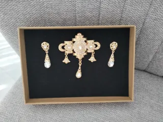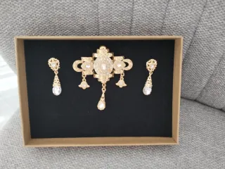 Conjunto de aderezos para niña con un diseño elegante y detalles brillantes. - Broche central con colgante. - Pendientes a juego. - Acabado dorado.