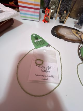 Conjunto de gargantilla y anillo a juego, ambos elaborados con peridoto y plata. - Gargantilla con cuentas finas de peridoto. - Anillo a juego con cuentas de peridoto.