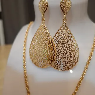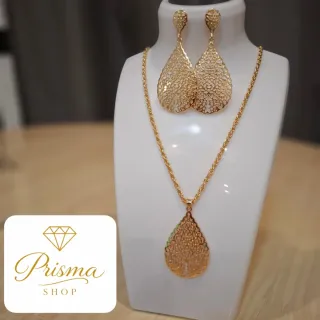 Elegante juego de collar y zarcillos con baño de oro. El diseño presenta un colgante con forma de lágrima calada y unos zarcillos a juego. - Collar con cadena. - Zarcillos colgantes. - Diseño calado.
