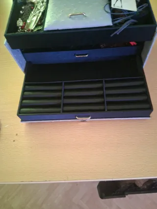 Elegante joyero de polipiel en tono azul claro, perfecto para organizar tus accesorios. - Compartimentos interiores para diferentes tipos de joyas. - Espejo integrado en la tapa. - Cierre seguro.