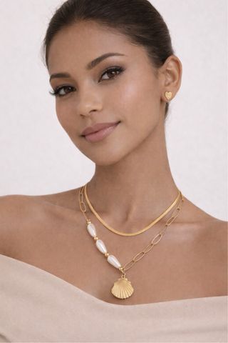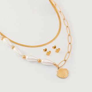 Elegante conjunto de joyería en acero inoxidable. - Collar con cadena de eslabones y detalle de perlas y concha. - Pendientes a juego con forma de corazón.