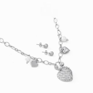 Elegante conjunto de joyería en acero, perfecto para añadir un toque de brillo. - Collar con colgante de corazón y perlas. - Pendientes a juego con perlas. - Diseño detallado en el corazón. - Medida del corazón: 2 cm. - Diámetro de los pendientes: 7 mm.