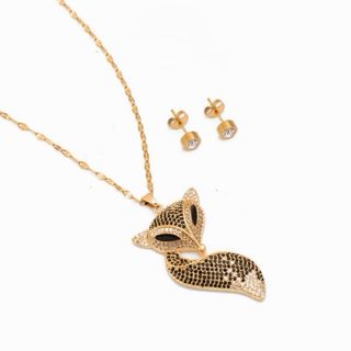Elegante conjunto de joyería fabricado en acero. El diseño combina detalles en negro y dorado, aportando un toque sofisticado. - Collar con colgante. - Pendientes a juego.