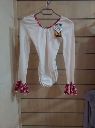 Precioso maillot de flamenco, ideal para tus ensayos y actuaciones. Es una prenda única y elegante. - Talla: (Añadir talla) - Color blanco con detalles rosas. - Mangas largas con volantes. - Tejido suave y cómodo.