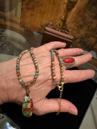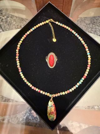 Sumérgete en la belleza natural con este conjunto de anillo coral y collar de jaspe imperial multicolor, Cada pieza es única, con vibrantes tonos y patrones veteados que añaden un toque bohemio y distintivo a tu estilo. ¡Captura la esencia de la naturaleza en tu piel! Medidas y descripción el las fotografías Hago lotes unificando envio #joyas-vintage- antiguedades-coleccionismo-modernista-boho - tribal-gótico-broches-pendientes-collares-conjuntos-alta bisutería-colgantes-metal antialérgico-piedras semipreciosas-Swarovski-plata