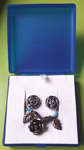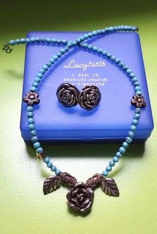 Elegante conjunto de bisutería con un diseño inspirado en la naturaleza. - Collar con cuentas turquesas y detalles plateados. - Pendientes a juego con forma de rosa. - Colgante central del collar con forma de rosa y hojas.