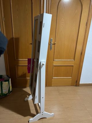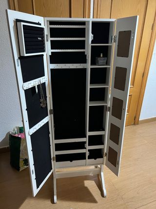 Mueble joyero con espejo. - Acabado en color blanco. - Puertas abatibles. - Compartimentos interiores para organizar joyas y accesorios. - Soporte para colgar collares y pulseras. - Bandejas para anillos y pendientes. - Estantes interiores. - Marco de espejo en las puertas interiores.