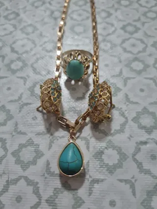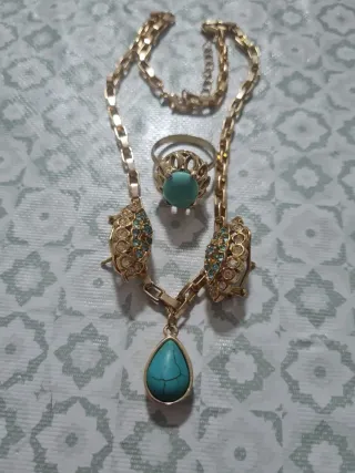 Elegante conjunto de joyería que incluye collar, anillo y pendientes. - Diseño con detalles dorados. - Piedras centrales en tono turquesa. - El collar tiene un colgante en forma de lágrima.