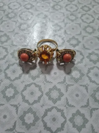 Conjunto de anillo y pendientes. - Anillo con piedra central naranja. - Pendientes con piedra central coral y detalles. - Acabado dorado.