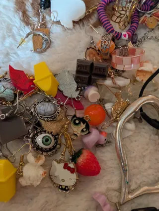 Descubre un tesoro de accesorios únicos en esta bolsa sorpresa de joyas. - Piezas con detalles en forma de luna y estrellas. - Incluye dijes de frutas y personajes. - Diseños divertidos y coloridos. - Incluye artículos de Sanrio, Las supernenas, y2k...