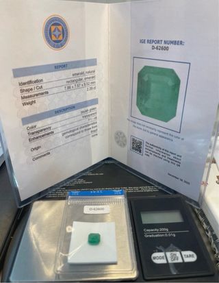 Preciosa Esmeralda Natural de Brasil Forma rectangular Quilates 2.29 Ct Medidas 7.86 x 7.57 × 5.52 mm Totalmente Natural Certificación IGE (instituto gemologico Español) Número : D-62600 Color Verde Azulada transparente Procedencia Brasil Está Esmeralda vale tanto como inversión o para engarzar cualquier joya , es sinceramente preciosa está sellada de laboratorio en blister,según laboratorio Ver fotos por favor,Se Envia con su certificado GRACIAS M.V✨💫
