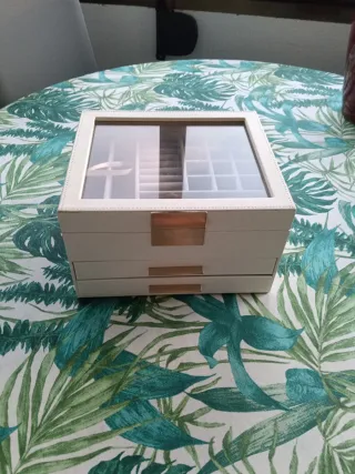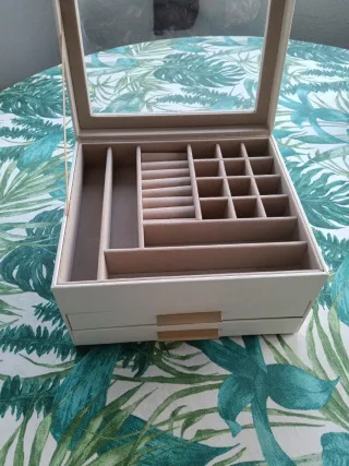 Elegante joyero de tres niveles con dos cajones, perfecto para organizar tus accesorios. Largo 23 cm. Ancho 20cm Alto 13'5 cm - Acabado exterior en color beige. - Detalles y tiradores en tono dorado. - Compartimentos interiores para diferentes tipos de joyas.