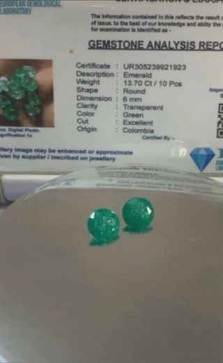 DOS ESMERALDAS COLOMBIANAS QUILATES :UN QUILATE CADA UNA MEDIDAS 6mm CADA UNA CERTIFICADAS VER FOTOS SON EXCELENTES PARA MONTAR CUALQUIER JOYA SE ENVIAN CON SU CERTIFICADO GRACIAS M.V✨💫