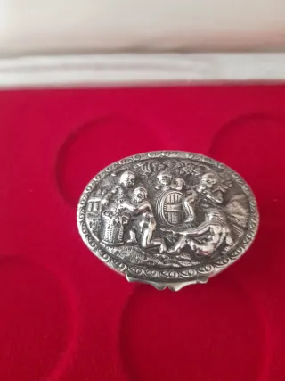 Cajita plata de 32 gramos de peso. Mide 5 x 4 x 1,05 cm. Grabada y con sus contraste en su base. Perfecto estado. - Material: Plata de ley. - Diseño: Figuras en relieve. - Forma: ovalada