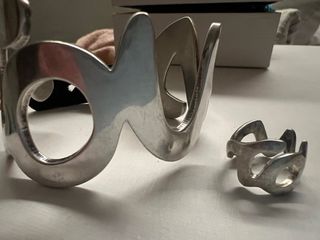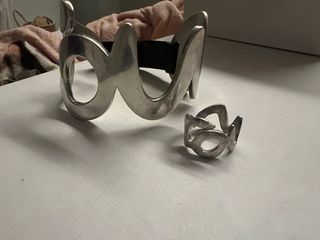 Elegante conjunto de brazalete y anillo. - Diseño moderno y distintivo. - Acabado plateado brillante. - son moldeables en tamaño