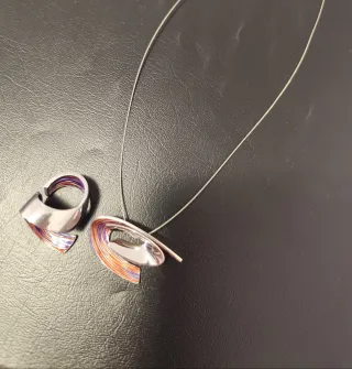 Elegante conjunto de joyería collar y anillo del prestigioso diseñador Daniel Vior. - Diseño moderno y abstracto. - Combinación de plata pulida con detalles en esmalte multicolor (naranja, morado). - Incluye un colgante y un anillo a juego.