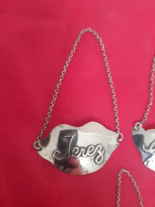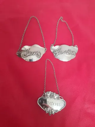 Conjunto de tres placas identificativas de plata de ley 925. - Placa Jerez mide 5 x 4 cm. - Placa Ginebra mide 5x 4 cm - Placa Licor con decoración de uvas mide 4,05 x 3,05 cm - Cadenas para colgar incluidas. LAS TRES PESAN 23 GR.