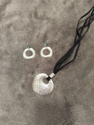 Elegante conjunto de joyería con un diseño moderno y llamativo. - Colgante con acabado martillado. - Pendientes a juego con el mismo diseño. - Cordón negro para el colgante.