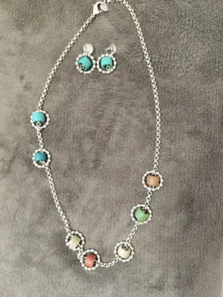Conjunto de collar y pendientes con un diseño único. - Diseño Sin receta. - Cadena plateada. - Cuentas de colores variados.