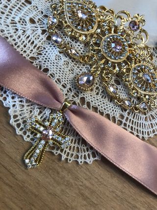 Conjunto de aderezo de fallera con detalles en rosa y dorado, que incluye una cruz y cinta. Nunca usado - Diseño intrincado con pedrería. - Colgante en forma de cruz adornado. - Cinta a juego. -Pendientes -Broche