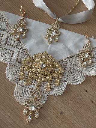Conjunto de aderezo fallero con un diseño intrincado y detalles brillantes. Nunca usado Con su caja - Pieza central con colgante en forma de gota. - Incluye pendientes a juego. - Incluye broche central