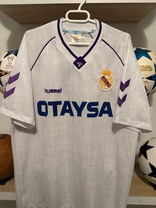 Camiseta de fútbol del Real Madrid de la marca Hummel, modelo Otaysa. - Diseño clásico en color blanco. - Detalles de la marca y escudo del equipo. - Patrón geométrico sutil en el tejido. Camiseta en perfecto estado. Una joya.