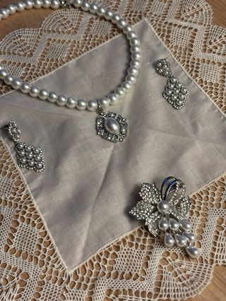 Conjunto de bisutería con un diseño delicado y elegante. - Colgante con forma de cruz adornada con perlas. - Pendientes a juego con lazos y perlas. - Broche grande en forma de lazo con perlas y pedrería.