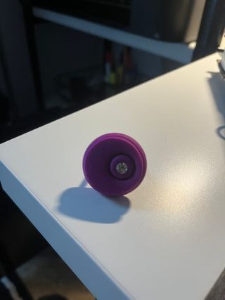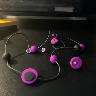 Conjunto de bisutería que incluye collar y pendientes. - Diseño moderno con cuentas esféricas. - Detalles circulares en color púrpura y negro.