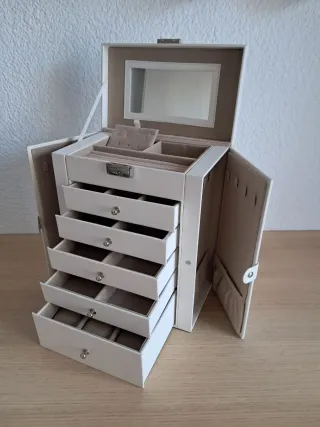Elegante joyero de polipiel en color blanco, perfecto para organizar tus accesorios. - Compartimos interiores para diferentes tipos de joyas. - Forrado con tela suave en color beige. - Tiene 6 niveles y 5 cajones. - Espejo integrado en la tapa. - Cajones extraíbles con tiradores. - 8 ganchos a cada lado para collares y cadenas. - Cerradura con llaves. - Amplio almacenaje. - Diseño moderno y funcional. - Todas las medidas del joyero están en la última foto.