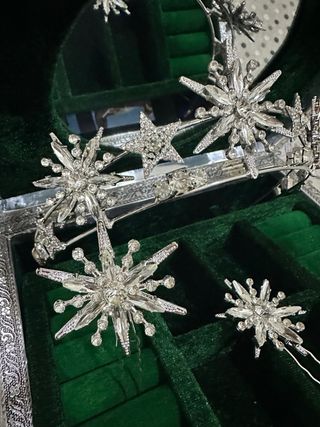 Conjunto de tiara y horquillas con diseño de estrellas. - Tiara con incrustaciones brillantes. - Tres horquillas a juego con el mismo diseño. - Ideal para complementar peinados. Separado: 3 horquillas 16€ Tiara: 35€