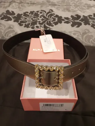 Elegante cinturón de la marca Alma en Pena. - Hebilla cuadrada adornada con pedrería. - Acabado metalizado brillante. - Talla L.