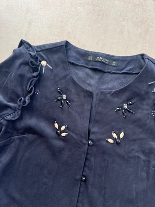 Elegante top de Zara con detalles de pedrería. - Diseño con cuello redondo. - Cierre de botones. - Mangas cortas con volantes. - Adornos de pedrería en forma de flor.