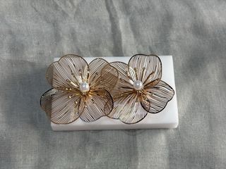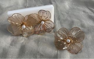 Elegante conjunto de bisutería con diseño de flor. - Incluye pendientes y anillo. - Acabado en tono dorado.