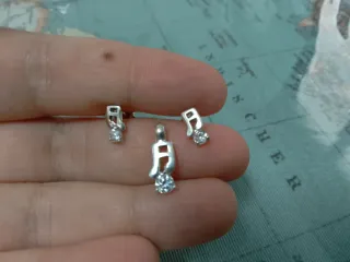 Conjunto de pendientes y colgante con diseño de nota musical y cristal. - Plata de ley 925. - Incluye dos pendientes y un colgante. - Sin cadena. Preciosos pendientes de nota musical de plata de Ley 925, como se puede apreciar en los sellos que tienen grabados, a juego con el colgante, con cristales transparentes incrustados que hacen un efecto muy bonito al sol. Tienen las tuercas también de plata de Ley 925.