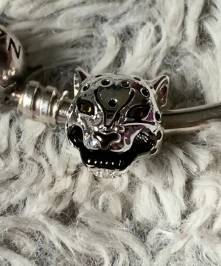 Charm de plata con diseño de tigre. - Detalles en negro y ojos ámbar. - Diseño detallado y llamativo.