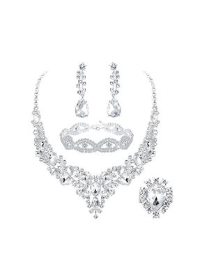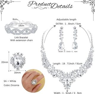 Elegante juego de 5 piezas de joyería, ideal para novias o damas de honor. Este set incluye un collar, pulsera, pendientes y anillo, todos adornados con cristales brillantes. Longitud de la cadena del COLLAR: 45,5 cm a 53,0 cm; Tamaño del colgante: 17,5 cm * 4,3 cm. Tamaño del pendiente: 5,5 cm * 1,4 cm. Peso (total): 71,5 g Anillas: regulables. - Collar con diseño en V. - Pulsera con detalles intrincados. - Pendientes colgantes con forma de lágrima. - Anillo a juego con gran cristal central. PAE2W