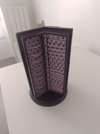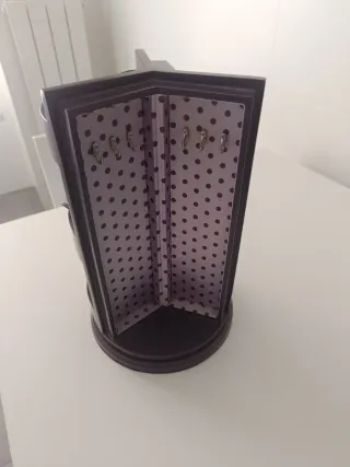 Elegante joyero con un diseño de esquina y un interior forrado con un estampado de lunares. - Tres compartimentos para organizar tus joyas. - Forro interior con estampado de lunares morados. - Estructura exterior de color marrón oscuro.