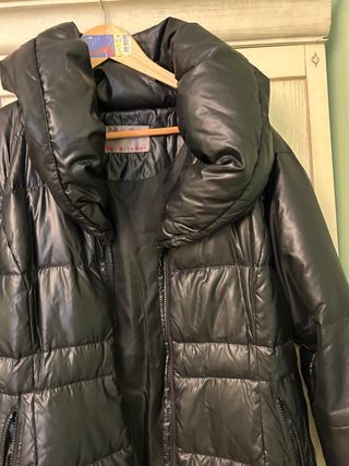 Abrigo negro acolchado de alta calidad. - Diseño moderno y elegante. - Cierre frontal con cremallera. - Bolsillos laterales con cremallera. - Cuello alto y envolvente.