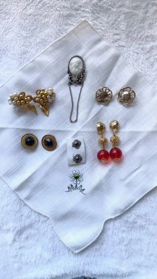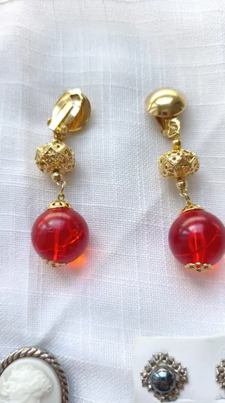 Conjunto de varias piezas de bisutería con un estilo clásico. - Broche ovalado con camafeo y detalles plateados. - Pendientes de clip con diseño floral y perlas. - Pendientes de clip con piedra negra. - Pendientes colgantes con cuentas rojas y detalles dorados. - Dos pendientes pequeños con pedrería gris.