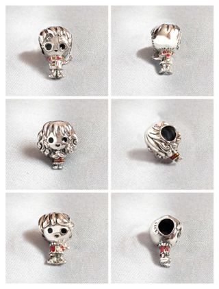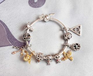 Conjunto Harry Potter: pulsera de aleación de metales con charms y colgantes en plata y aleación en tono dorado y rosado: - Charm Harry. 12€. - Charm Hermione. 12€. - Charm Ron. 12€. - Charm Sombrero. 10€. - Charm letras HP y símbolos. 10€. - Charm escudo y Colegio Hogwarts. 10€. - Colgante Snitch. 12€. - Colgante triple: gafas, rayo y escoba. 12€. - Colgante Patronus cierva Snape. Con el grabado: Siempre. 12€. - Colgante LLave Alada. 12€. - Colgante Reliquias de la Muerte. 10€. - Pulsera rígida con cierre Snitch Dorada y alas móviles, de 6 cm de diámetro interno / Circ. 19 cm. Talla M. 12€. Precio unitario. Sólo envío.