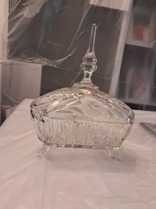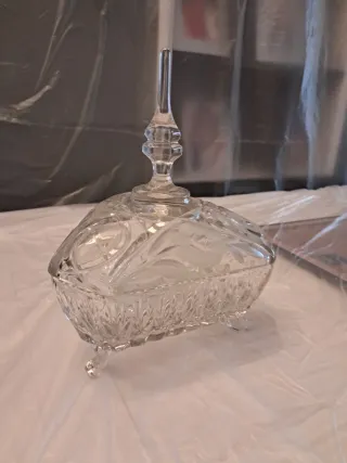 Elegante joyero de cristal tallado con un diseño intrincado y patas decorativas. Perfecto para almacenar pequeñas joyas, caramelos, llaves o como pieza decorativa. - Material: Cristal - Diseño: Patas decorativas y tapa con pináculo. - Acabado: Brillante y transparente.