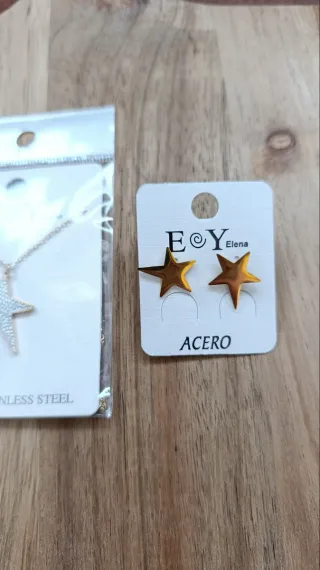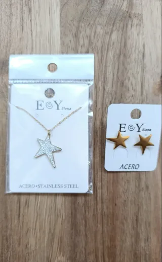 Conjunto de collar y pendientes con diseño de estrella. - Collar con colgante de estrella adornado con pequeñas piedras. - Pendientes a juego con forma de estrella. - Fabricado en acero inoxidable.