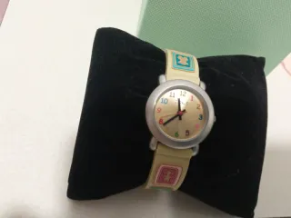 Reloj de la marca Tous para niña, con un diseño divertido y colorido. - Correa beige con detalles de ositos y figuras. - Esfera con números de colores.