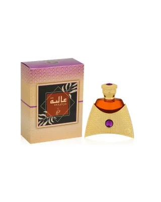 Elegante frasco de perfume con detalles dorados y un toque de color naranja en el líquido. Presenta una joya morada en el tapón y en la base. - Diseño ornamental en el cuerpo del frasco. - Tapa dorada con gema morada. - Base dorada con gema morada. - aceite