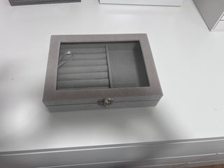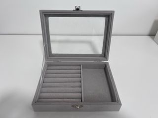 Elegante joyero con acabado en terciopelo y tapa de cristal. -Medidas: 20cm de largo x 15cm de ancho x 4,5cm de alto. - Compartimentos interiores para organizar tus joyas. - Cierre metálico frontal.