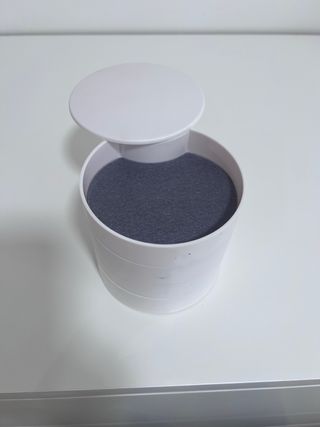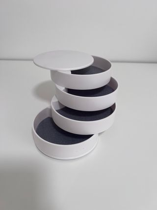 Organizador cilíndrico con cuatro niveles para guardar tus joyas y accesorios. -Medidas: 10 cm x 10 cm. Cada nivel mide 2,5cm de alto. - Diseño apilable para ahorrar espacio. - Tapa redonda. - Interior forrado.