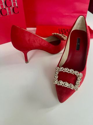 Elegantísimos zapatos de salón de Carolina Herrera, en su icónico tono rojo y pedrería. Tacón medio, muy cómodos. Usados en una reunión de trabajo durante menos de 2 horas, están prácticamente nuevos. Talla 37. Con su embalaje, funda de tela, etc. Zara, Loewe, Carolina Herrera, Bimba y Lola, Tous, Gucci, Aristocrazy, calvin klein, Prada, miu miu, Massimo Dutti, Michael Kors, Manoush, Teté by Odette, etc.