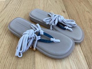 Sandalias planas de la marca Joy Colors en color beige, con cuerdas para atar a la pierna,nuevas sin estrenar. Son del número 40, aunque tallan un poco pequeñas (la suela mide 27,3 cm). Hago envíos. # calzado plano sandalia primavera verano playa chica mujer señora regalo barato barata baratas #