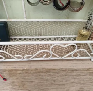 Este organizador de joyas es perfecto para mantener tus accesorios ordenados y a la vista. Su diseño combina blanco con toques de color. - Estructura de metal. - Múltiples colgadores para collares y pendientes. - Bandeja inferior para objetos pequeños.